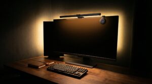 モニターライトは「明るくする道具」ではなく「映り込みを排除する道具」だ。BenQ ScreenBar Haloはモニター上部に設置し、手元を照らしながらも画面への光の反射を物理的にゼロにする設計を持つ。背面のハロー照明が壁を間接的に照らし、目の疲れを軽減する効果もある。