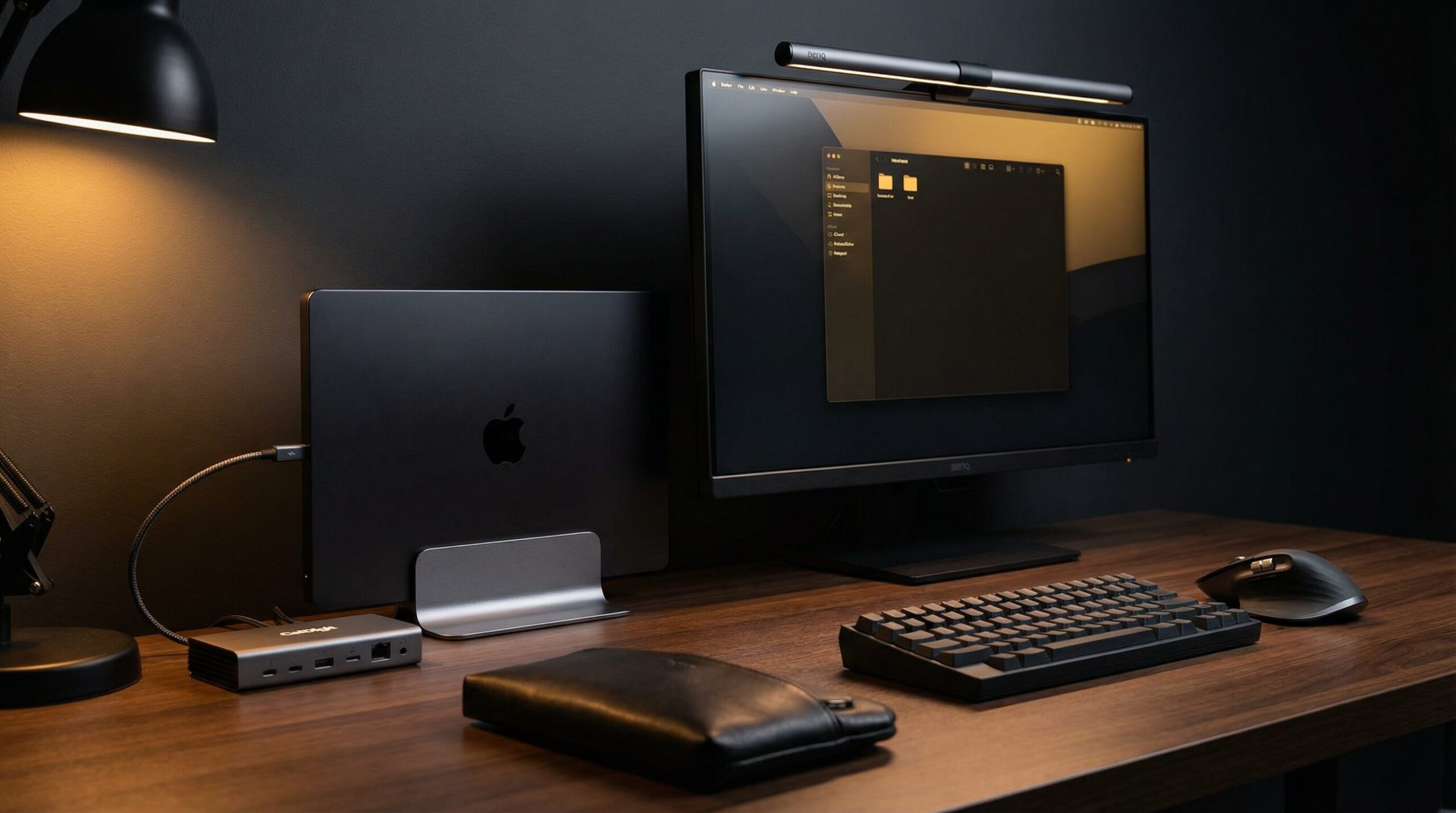 クラムシェル運用において、MacBookの「置き場所」を決めることはデスク設計の基本だ。縦置きスタンドはMacBookを立てて収納することで、デスクの有効面積を最大化し、視覚的なノイズを排除する。