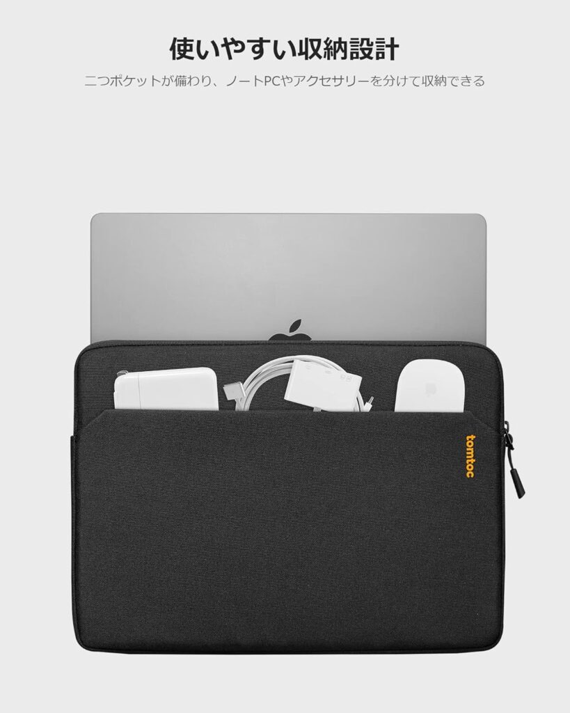 約30万円の「資産」を傷から守る設計として、インナーケースは必須だ。バッグの中でMacBookが擦れて傷つくのを防ぎながら、取り出しやすさも確保する。Tomtocの14インチ対応スリーブが品質・価格のバランスで優れている。