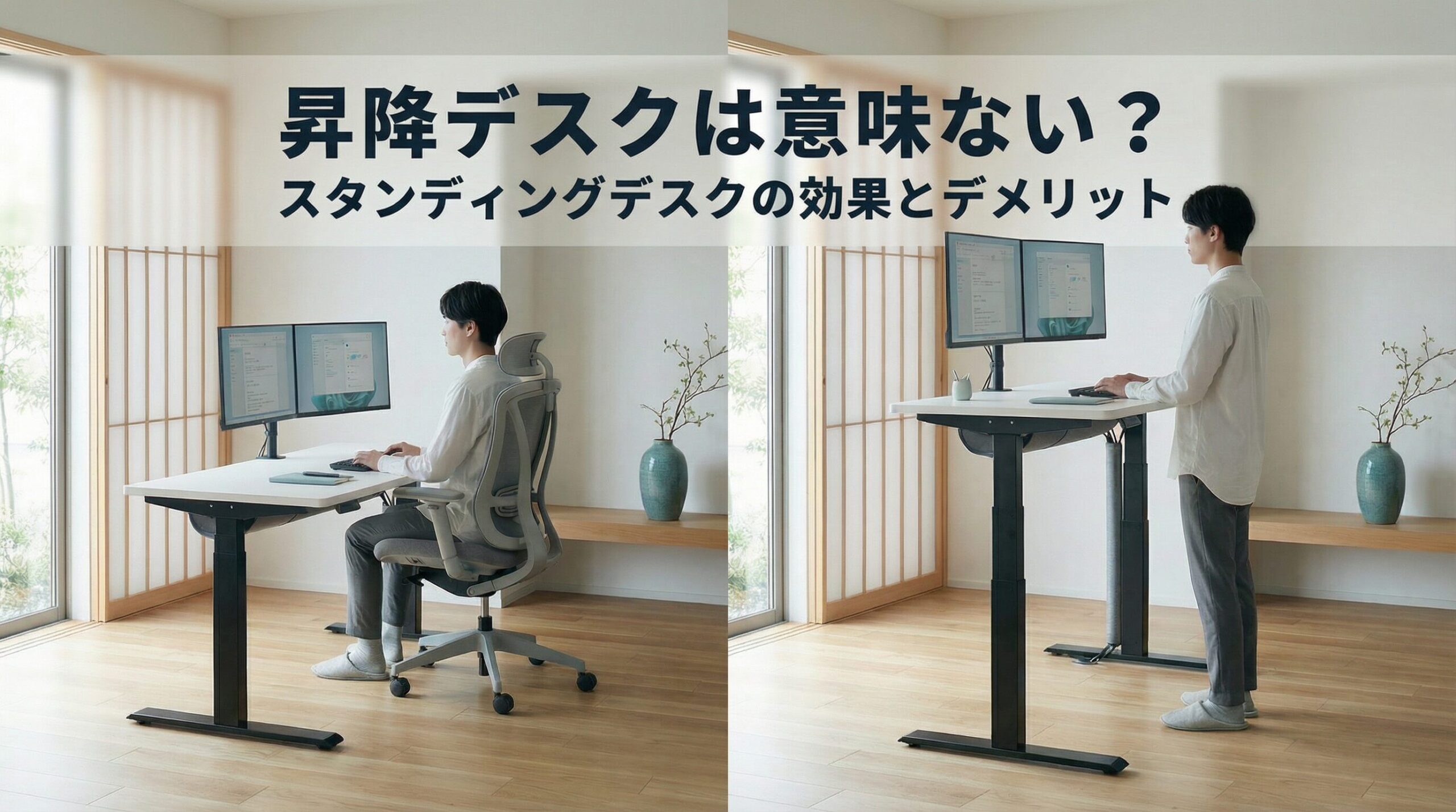 つまり、昇降デスクは「意味ない」わけではありません。ただし、立っているだけで劇的に痩せたり、腰痛が自動で治ったりする魔法の家具でもありません。