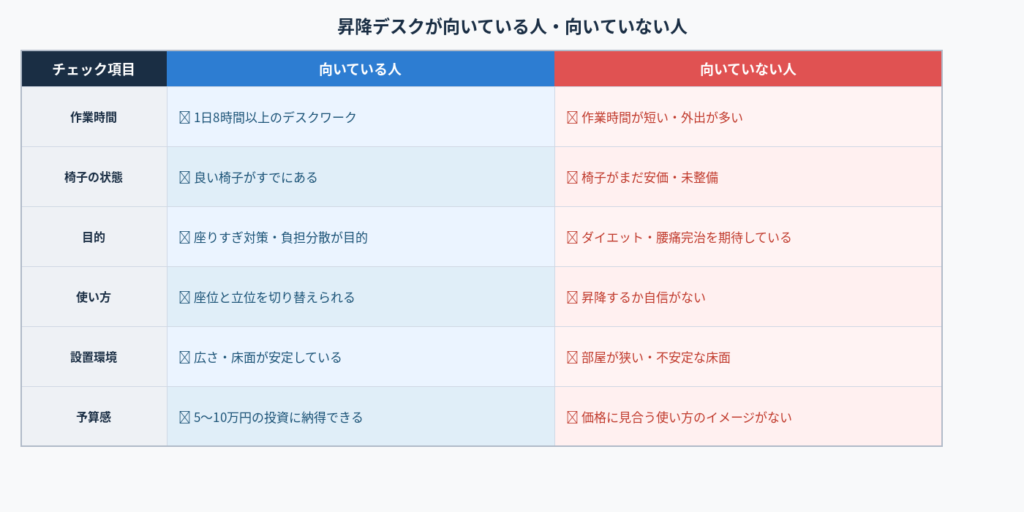 効果が出る可能性があるのは、正しい高さで設定し、座りっぱなし・立ちっぱなしを避けて、仕事中に姿勢を切り替えられる人です。逆に、使い方が曖昧なまま買うと、高価で重いだけの「動かないデスク」になりやすい。