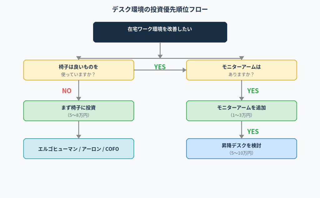 | 買う前の優先順位 | 椅子 → モニターアーム → 昇降デスク |