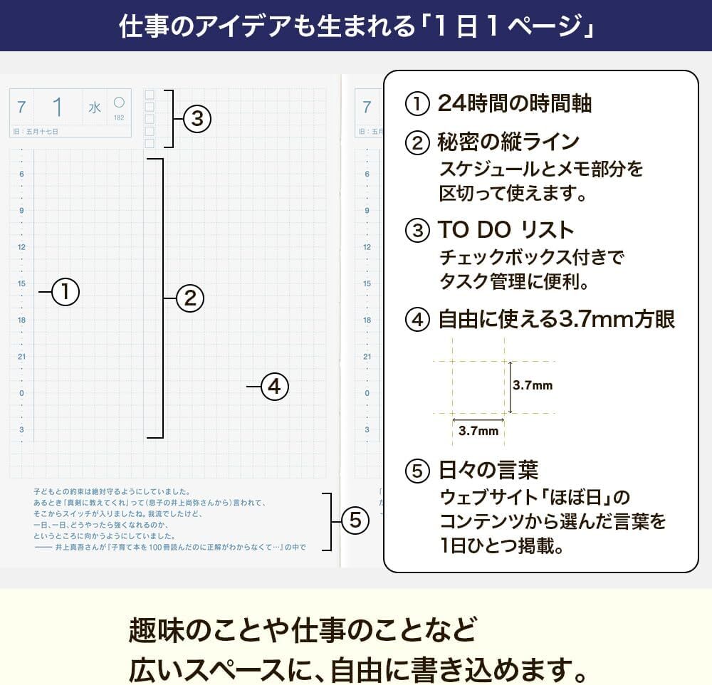 1日1ページのフォーマットで、予定・タスク・メモ・振り返りを自由に書けます。方眼紙のレイアウトが書きやすく、ほぼ日手帳の代名詞的存在です。