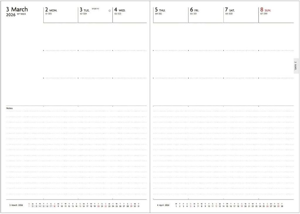 - 週間レフト:左ページに週の予定、右ページにメモ。バランス型