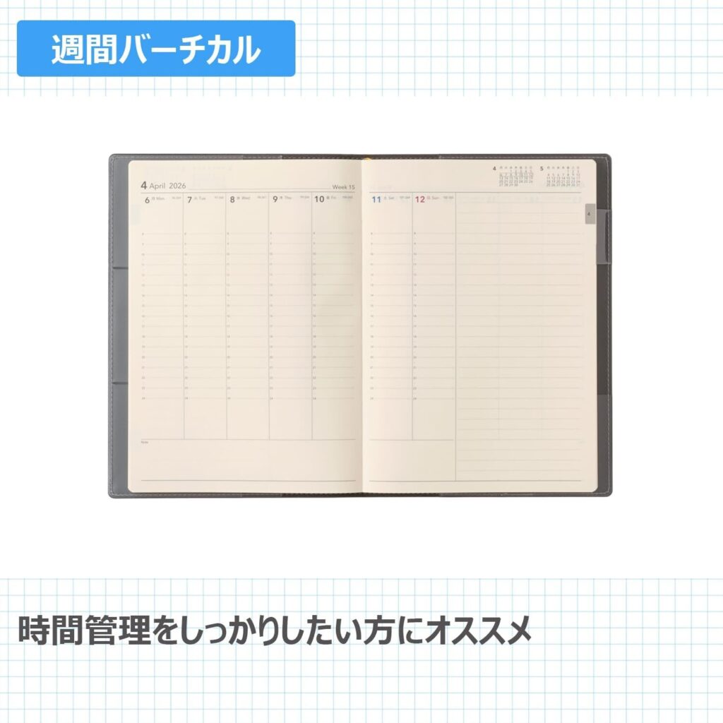 会議が多く時間軸で予定を管理したい人は週間バーチカル、予定とメモを同じページで管理したい人は週間レフトが向いています。打ち合わせのメモも手帳に書きたい場合は、メモ欄が広い週間レフトが使いやすいです。