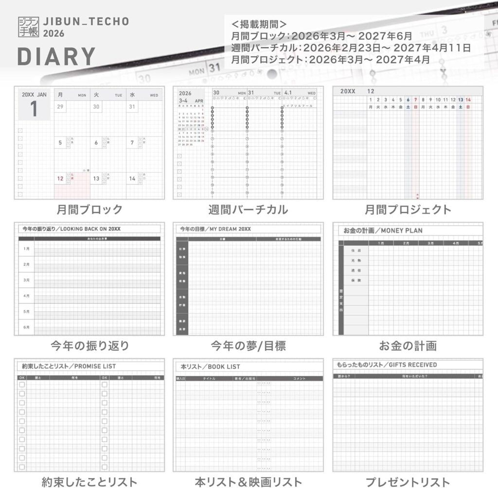 コクヨの「ジブン手帳」は、バーチカル型の週間ページに加え、月間・メモ・ライフログのセクションが充実しています。仕事だけでなく、生活全体を1冊で管理したい人に向いています。