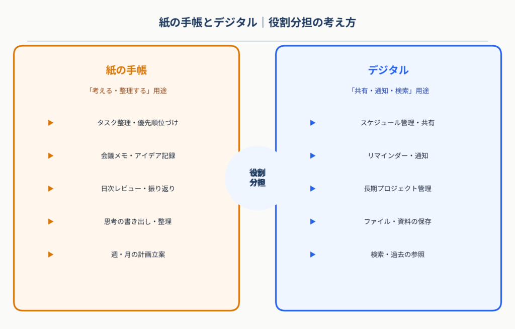 紙とデジタルは対立ではなく、役割を分担する関係です。デジタルで「予定と通知」を管理し、紙で「考える・整理する」を担当するのが、最も続けやすい使い方です。